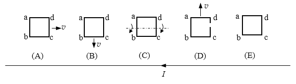 如图所示,水平放置的长直导线MN中通以恒定电流,矩形金属线框abcd与导线在同一平面内,bc边平行于长直导线,其分别进行以下几种运动:(A)向右平动;(B)向下平动;(C)绕通过ab中点与cd中点的轴转动;(D)以长直导线为轴转动;(E)向上平动(cd边有一缺口);(F)由正方形变成圆形。试判断哪几种运动情况下线圈中有感应电流产生?