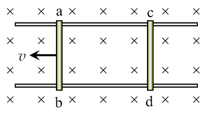 (1)导体棒ab向左滑动切割磁感线,根据右手定则,产生a→b的感应电流,然后从d流向c。由于cd处于磁场中,因而会受到磁场力的作用,根据左手定则,受到的磁场力方向向左,所以cd将向左运动。