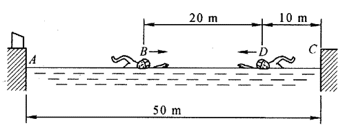 如图所示,游泳池中有一个人沿直线游泳。他以A为起点,先经过B点,后至池对岸C点后返回至D点。各段距离在图上已标明。