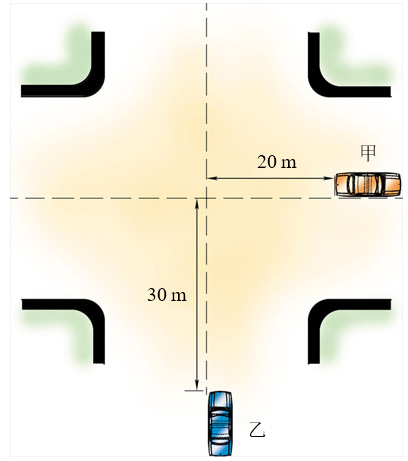 98.如图所示,甲、乙两辆相同型号的轿车,它们的外型尺寸如下表所示,正在通过十字路口的甲正常匀速行驶,车速为10 m/s,车头距路中心O的距离为20 m,此时乙也匀速行驶,车头距路中心O的距离为30 m。若乙闯红灯违章行车,则乙车的速度在什么范围之内,必定造成撞车事故 ?