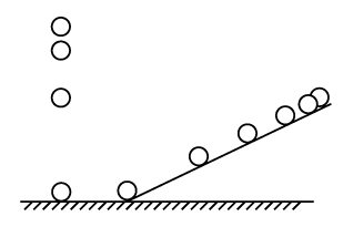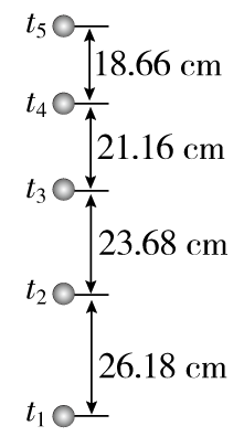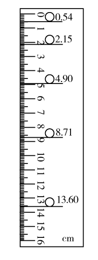 84.由于当年实验条件的限制,伽利略无法直接对落体运动进行实验研究,而今天即使在中学实验室里,我们也可以通过实验来验证落体运动的规律。如图是某次实验中获得的质量为m的小球下落时的频闪照片,频闪间隔是\(\frac{1}{{30}}\) s。根据此照片计算(结果保留三位有效数字 )