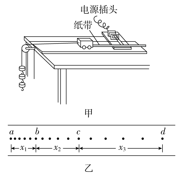 (B)让小车拖着纸带运动,打点计时器在纸带上打下一系列小点,重复几次。选出一条点迹比较清晰的纸带,从便于测量的点开始,每五个点取一个计数点,如图乙中a、b、c、d等点;