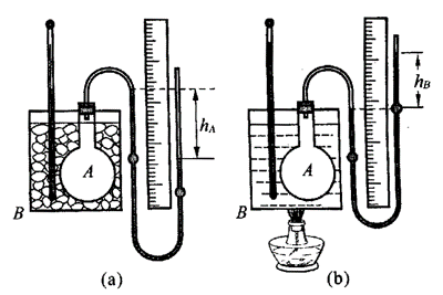 33.在图所示的装置中,分别在烧瓶A中封有相同体积的空气,并与气压计相连。初始时,图(a)、(b)容器B中均为空的,温度计示数相等,气压计两侧液面平齐。然后分别在图(a)容器B中放入冰水混合物,在图(b)容器B中放入热水。经过一段时间后,调整气压计右侧管臂的高度,保持左侧管臂内液面高度不变,如图(a)、(b)所示。