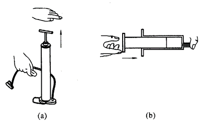 37.图(a)中将打气筒出口的橡皮管夹住,用力推下活塞,放手后活塞向上弹起;图(b)中堵住注射器的出口;用力向外拉活塞,放手后活塞会自行缩回。比较这两个过程遵循了什么相同的规律。
