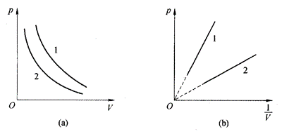41.如图(a)和(b)所示,两个图线1、2分别代表一定质量的气体的两个等温变化过程。请在图(a)和(b)中分别判定哪一个等温过程中的气温高,并说明理由。