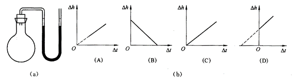 58.如图(a)所示,一只贮有空气的密闭烧瓶,用玻璃管与汞气压计连接,气压计两管内的汞面在同一水平面上。现降低烧瓶内空气的温度,同时移动气压计右管,使气压计左管的汞面保持在原来的水平面上,则表示气压计两管内汞面高度差Δh与烧瓶内所降低的温度Δt之间的关系图线是图(b)中的( )。