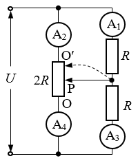 15.如图电路中,总电压U保持不变,滑动变阻器总电阻为2R,当滑片P位于变阻器中点O时,四个电流表A1、A2、A3、A4上示数都为I0。试讨论说明当滑片P向上滑到Oʹ(变阻器四分之一点)点时,四个电流表示数的变化情况。
