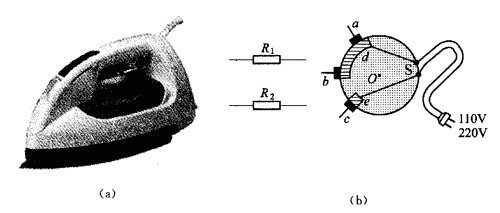 26.如图(a)所示是一种电熨斗,它由两个相同的电热丝R1和R2组成。适用于两种电压,只要转动交换开关S,就能分别用于110 V或220 V电源,且两种情况下发热功率相同。请你在图(b)中将R1、R2与a、b、c三个接线柱连接起来,使其具有这种功能。图(b)中阴影部分是导电金属条,它固定在S上。如图状态,d使ab短路,e与c相接,转过60°后,e与b相接,d仅与a相接,金属条分别与电源插头相连接。