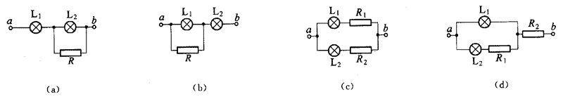 27.如图中的(a)、(b)、(c)、(d)四个电路中,小灯L1上标有“6 V 0.3 A”字样,小灯L2上标有“4 V 0.2 A”字样,电压Uab均为U=10V。试判断小灯不能正常发光的电路是________(选填各图下的字母代号,下同);小灯均正常发光,而消耗电功率最小的电路是_______。