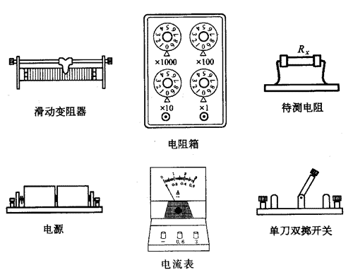 40.利用图所示的电源、滑动变阻器、电阻箱、电流表和单刀双掷开关器材。请你设计一个电路,用替代法测量一个待测电阻的阻值,连接实物图并画出电路图。
