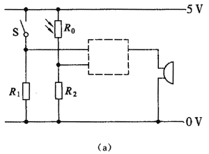 图(a)是用一种逻辑电路和按钮开关、光敏电阻、蜂鸣器等元件组成的防盗报警器电路图。该报警器的功能是:当放在保险箱前地板上的按钮开关S被脚踩下而闭合,同时安装在保险箱里的光敏电阻R0被手电筒照射时,蜂鸣器就会发出呜叫声。试回答该报警器使用了哪一种门电路,并在电路的虚框内画出该门电路符号,然后用“逻辑电路实验器”完成此项实验。请考虑R2与R0的大小关系如何?