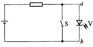 43.如图所示,V是一个发光二极管,在a、b两端加上一定的电压(a端为高电势)时,发光二极管会发光。该电路是一个_______电路,当开关S处于________状态时,发光二极管不亮。