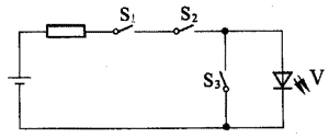 44.如图所示电路中,要使发光二极管发光,某些开关必须闭合,某些开关必须断开。请完成反映这种控制条件与控制结果的真值表。开关闭合为“1”,断开为“0”,V亮为“1”,灭为“0”。