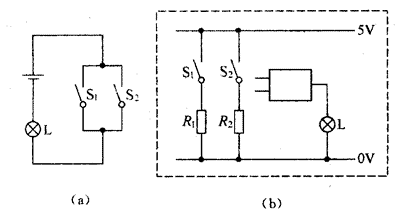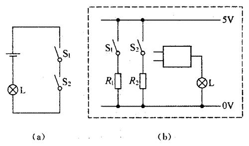 46.如图(a)所示是一个模拟________逻辑关系的电路,请利用与之相对应的门电路实现相同的功能,并完成图(b)虚框内的电路。