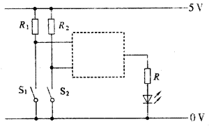 49.图是应用某种逻辑电路制作的车门报警电路。图中的两个按钮开关分别装在汽车的两扇门上,只要任何一个开关处于开路状态(输入为逻辑1),那么输出也是逻辑1,发光二极管(警报灯)就发光。请你根据要求,在电路图的虚线框内画出门电路符号,用“逻辑电路实验器”完成此项实验,并写出该门电路的真值表。