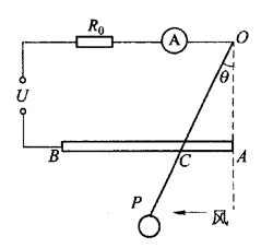 68.如图所示是某同学设计的一种风力测定仪的原理图,它可以通过电流表的示数来测定风力。图中P是一个重力G=4 N的小球,悬挂在一根旧金属线下面,O为悬挂点,AB是一根水平放置、粗细均匀的光滑的电阻丝,长L=30 cm,电阻值RAB=20 Ω,保护电阻R0=5Ω。电阻丝、保护电阻、电流表和悬挂小球的一部分金属丝串联起来接在电压U=10V的电路上。在无风时金属丝与电阻丝A端接触。OA=10cm,当水平风力向左作用于小球时,悬线将偏过一定的角度θ。金属线与电阻丝相交于C点,接触良好,金属线的电阻不计。问: