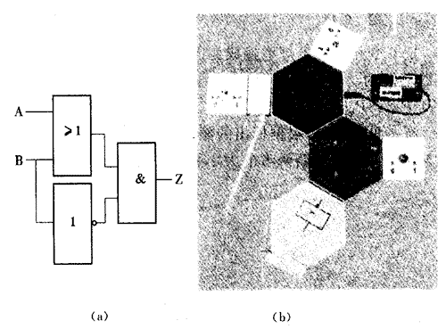 69.“与”“或”“非”三种基本的门电路通过组合可形成各种复杂的电路。如图所示,请按照电路图(a),利用逻辑电路实验器搭建实验电路[图(b)],并逐个分析各门电路输入、输出之间的逻辑关系。