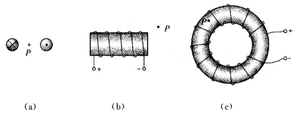 8.试画出如图所示三种情况中,电流产生的磁场里经过P点的一条磁感线[图(c)的P点在圆管内]。