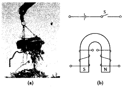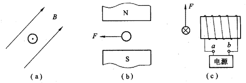 水流通以较大电流时会偏转;同方向电流会吸引;放在强磁铁上小盆中盛导电液,通电时会旋转。
