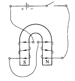 11.图(a)所示的是一种电磁起重机。为了安全,它是用永久磁铁制成的,它能将杂碎铁块吸住而不掉下来。在它的两臂上绕有线圈,并与电源、按钮开关 S 构成回路。当需要释放铁块时只要按下 S,产生一个与原磁极相反的磁场而抵消原磁场,铁块便能脱落。请你在图(b)中按此要求连接电路。