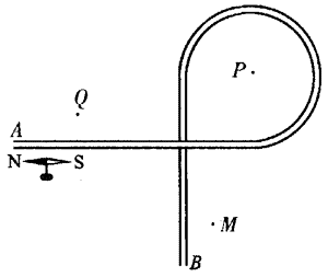 11.如图所示,AB是一根通电导线,绕了一个圈,它处于纸面所在的平面上,导线下有一个小磁针,通电时N极指向纸外。试在纸面上画出导线附近M、P、Q处磁感应强度的方向(用“·”或“×”表示)。