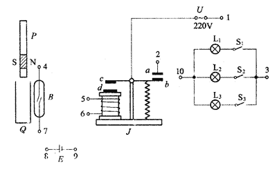 14.如图所示是宾馆中常用的一种总电门卡,进房间时只要将带有磁铁的卡P插入盒子U中,这时由于磁体吸引簧片,开关B就接通。通过继电器J使整个房间的电器的总开关接通,房客便能使用室内各种电器。出门时只要取走此卡,总门切断,所有电器都不再工作。图中E为低压电源,U为220 V电源,L为灯泡,S为开关。当继电器工作时,cd相吸,ab便接通。请你将图中各接线端1、2、3、4、5、6、7、8、9、10适当地连接起来,构成能正常工作的电门卡电路。