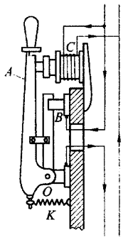 2.如图所示是生产中常用的闸刀开关。图中A是导电的闸刀,B是金属簧片(可以与闸刀保持紧密接触或分离),C是带铁芯的线圈,O是固定转动轴(即支点),D是杠杆(右边下降时左边上升),K是弹簧。图中箭头是电流方向。试一说明这种闸刀开关在什么情况下会自动断开电源?