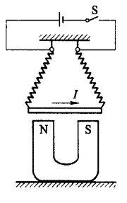 16.如图所示,蹄形磁铁放置在地面上,在它的上方悬挂一根用软弹簧连接着的金属棒。上部接有电源。开始时,金属棒处于静止状态,通电后可观察到什么现象?