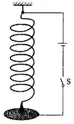 25.有人设计了一个小玩艺如图所示。将一根细而柔软的铜丝绕成螺旋弹簧形状,并悬挂起来,弹簧下端焊接一簇更细的铜丝。铜丝的下端与一块圆形铜片相接触,铜片及弹簧上端分别与电源、开关相接。试问:合上开关后会看到什么现象?为什么?这个装置能否实现设计者的期望?请你试一试。