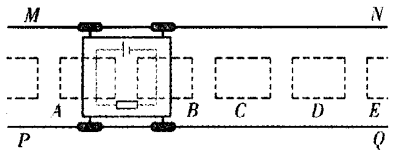 26.如图所示,平行轨道MN和PQ上有一辆平板小车,车上有一个通电线框,图中虚线框A、B、C、D、E等是磁场区域,内有垂直纸面向里或向外的磁场。