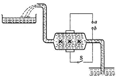 27.如图所示是一种输送导电液的水泵——电磁泵,它能将液体抽送到高处。试说明电路中a、b两端应接电源的什么电极?说出此水泵的工作原理。