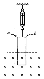 29.如图所示,用特制的弹簧测力计将单匝线框悬挂在匀强磁场中,线框长为10 cm,宽为2 cm(引线a、b可与电源相接),线框平面与磁场相垂直。线框通电前弹簧测力计的示数为0.1 N,通以1.6 A电流后,弹簧测力计的示数变为0.11 N。求: