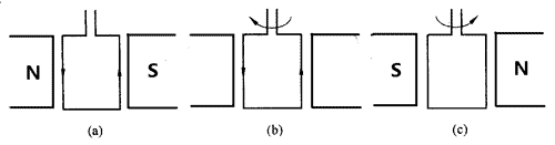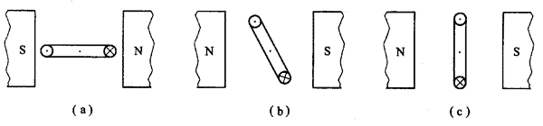 47.如图所示,在磁极两极间有一个线框。在(a)、(b)、(c)三种情况下,线框两条边的受力情况如何?转动情况如何?