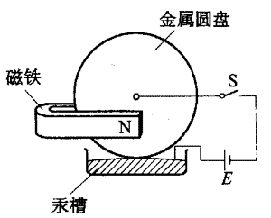 金属圆盘通电后,有电流从汞槽通过金属圆盘流入转轴,在磁场作用下,受到向左的磁场力,使圆盘顺时针转动。