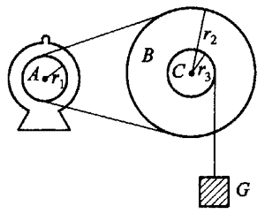 56.如图所示是一架提升重物的卷扬机的结构图。皮带轮A的半径 r1 = 10 cm,B的半径 r2 = 40 cm,提升货物轴 C 的半径为 r3 = 10 cm,轮 B 与轴 C 是固定在一起的。今要使重 1600 N 的货物以 1 m/s 的速度匀速上升,电动机的转速多大?若电动机效率为 80%,则应选用多大功率的电动机?(其他机械损耗不计)