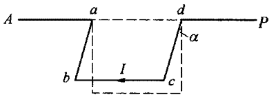 62.均匀U形金属框abcd置于匀强磁场中,它可以绕AP轴转动,如图所示。若导线中电流方向是由P到A,欲使导线平面往纸外转出α角后达到平衡,则磁场方向应是( )。