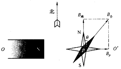 实际上P点既有磁体的磁场,又有地磁场,该处的磁场应是一个合磁场。因此,小磁针将静止在合磁场B合的方向上(设它与B地的夹角为θ)。