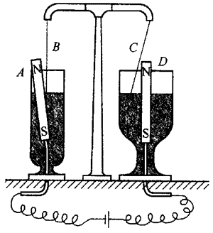 68.物理学家法拉第在研究电与磁的关系时,曾做过著名的“电磁旋转实验”,如图是实验原理图。这个实验的现象是:如果载流导线附近只有磁铁的一个极,磁铁就会围绕导线旋转;反之,载流导线也会围绕单独的某一磁极旋转。这一实验装置实际上就是最早的电动机“模型”。图中A是可动磁铁,B是固定导线,C是可动导线,D是固定磁铁。图中灰色部分表示汞,下部跟电源连接。请你判断这时A和C将怎样转动(自上向下看是顺时针还是逆时针转动)?