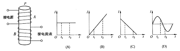 7.某一实验装置如图所示,在铁芯P上绕着两个线圈A和B,如果线圈A中电流I和时间t的关系有图中的四种情况,那么在t1~t2这段时间内,下列四种情况在线圈B中观察不到感应电流的是( )。