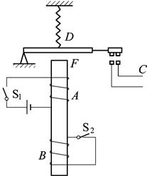 当S1断开的瞬间,F中磁通量突然变小,B中产生感应电流,使电磁铁有短暂的磁性而吸住D,所以能达到“延时”的目的。