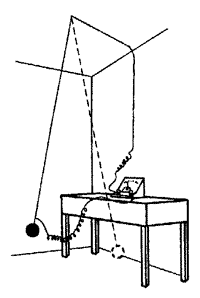 当导线切割微弱的地磁场时也会产生感应电流,用右手定则还能判断电流的方向。现在用下面的器材做一个小实验,来进行验证。在长约2.5~3.0 m(以房屋高度而定)的铜丝上悬挂一重物。制成一个单摆。铜丝上下两端各用一根软导线引出.跟灵敏电流计相连接,如图所示。让摆在地磁场中摆动时(振幅约1.0~1.5 m),观察灵敏电流计指针是否偏转?怎样才能使实验效果更明显?当摆向右运动时。根据你选定的地磁场方向,判断铜丝中感应电流的方向。
