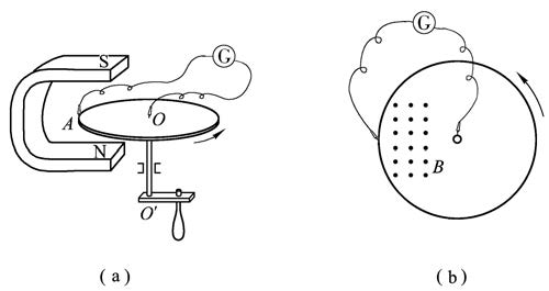 24.法拉第圆盘发电机是一个在磁场中转动的金属圆盘.它可绕垂直于圆盘的OOʹ轴转动。匀强磁场方向与圆盘的轴线平行,且竖直向上,如图(a)所示。用电刷将灵敏电流计接于圆盘中心和边缘之间[俯视图(b)]。当圆盘作逆时针方向转动时,在俯视图(b)中通过灵敏电流计的电流方向是________。