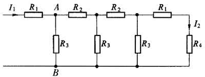 57.在如图所示的电路中,R1=200Ω,R2=400 Ω,R3=800 Ω,R4=600 Ω,由此可知A、B间的电阻RAB=________Ω;电流I1∶I2=________。