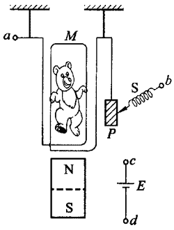 65.如图所示是一个小制作“秋千小熊”。线框M用细线悬挂起来,线框下面有固定的磁体,S是一个触点开关,E是电源,P可跟随线框一起摆动。当线框向前摆起时,开关S断开;线框在竖直位置时,开关S接通。为了使小熊不停地摆动,好像在玩秋千一样,应当将接线柱a、b、c、d如何合理连接?(画在图上)