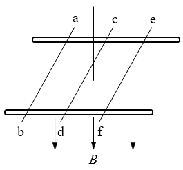 66.如图所示,在水平放置的彼此平行的光滑金属导轨上,垂直于导轨放置三根互相平行的导体棒ab、cd、ef,并始终与导轨保持良好接触。整个装置处于垂直于导轨平面的匀强磁场中。在图上分别画出,当cd棒向右运动时,导体棒ab、ef中的电流方向及运动方向。