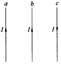 70.如图所示,a、b、c三根通电导线在同一平面上,通以同样大小的电流,a与b的电流向上,c的电流向下,则下列说法中正确的是( )。