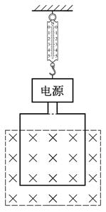 78.如图所示,整个实验装置悬挂在弹簧测力计下,装置下端是绕了100匝、宽度为10 cm的线框,线框下边处在匀强磁场中,且磁场方向与线框平面垂直。当线框中通以2 A电流时,弹簧测力计示数为6 N。保持电流大小不变,只改变电流方向,弹簧测力计的示数变为5 N。求: