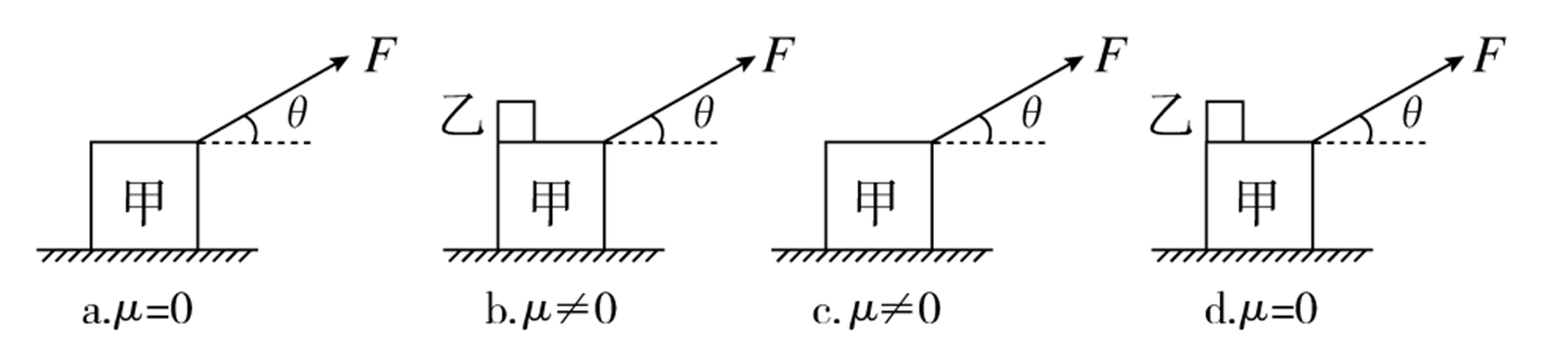 2.如图所示的 a、b、c、d 中,质量为 M 的物体甲受到相同的恒力 F 的作用,在力 F 作用下使物体甲在水平方向移动相同的位移。μ 表示物体甲与水平面间的动摩擦因数,乙是随物体甲一起运动的小物块,比较物体甲移动的过程中力 F 对甲所做的功的大小( )