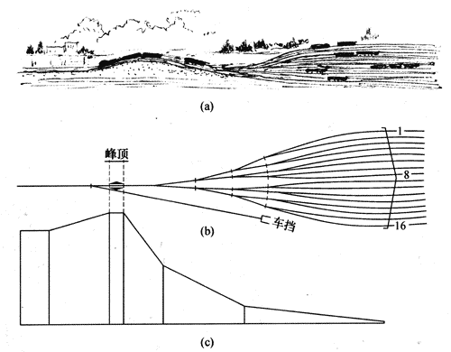 1.铁道上的列车车厢经常需要分类编组,图(a)所示的就是常用的“驼峰”编组站,它是一种为列车提供分解车体进行编排组合各种车厢的设施。它因从侧面看酷似骆驼的背部而得名。图(b)、(c)是它的俯视图和侧视图,列车大约以1.2 m/s的速度倒着将车厢推至峰顶,然后脱开车钩,让车厢滑入应进入的车道,实行编组。为了防止进入编组道的车速过大,滑行途中还装有减速器。