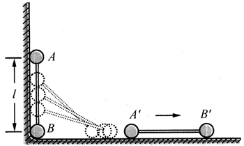 2.如图所示,质量为m的A球与质量为2m的B球由轻杆相连,两球心间距离为l,放置在成直角的光滑槽内。开始时轻杆成竖直状态,两球均处于静止状态。放开后,A球沿竖直槽壁向下滑动,B球沿水平槽壁向右滑动,最终两球一起在水平槽中滑动,求两球最终速度。